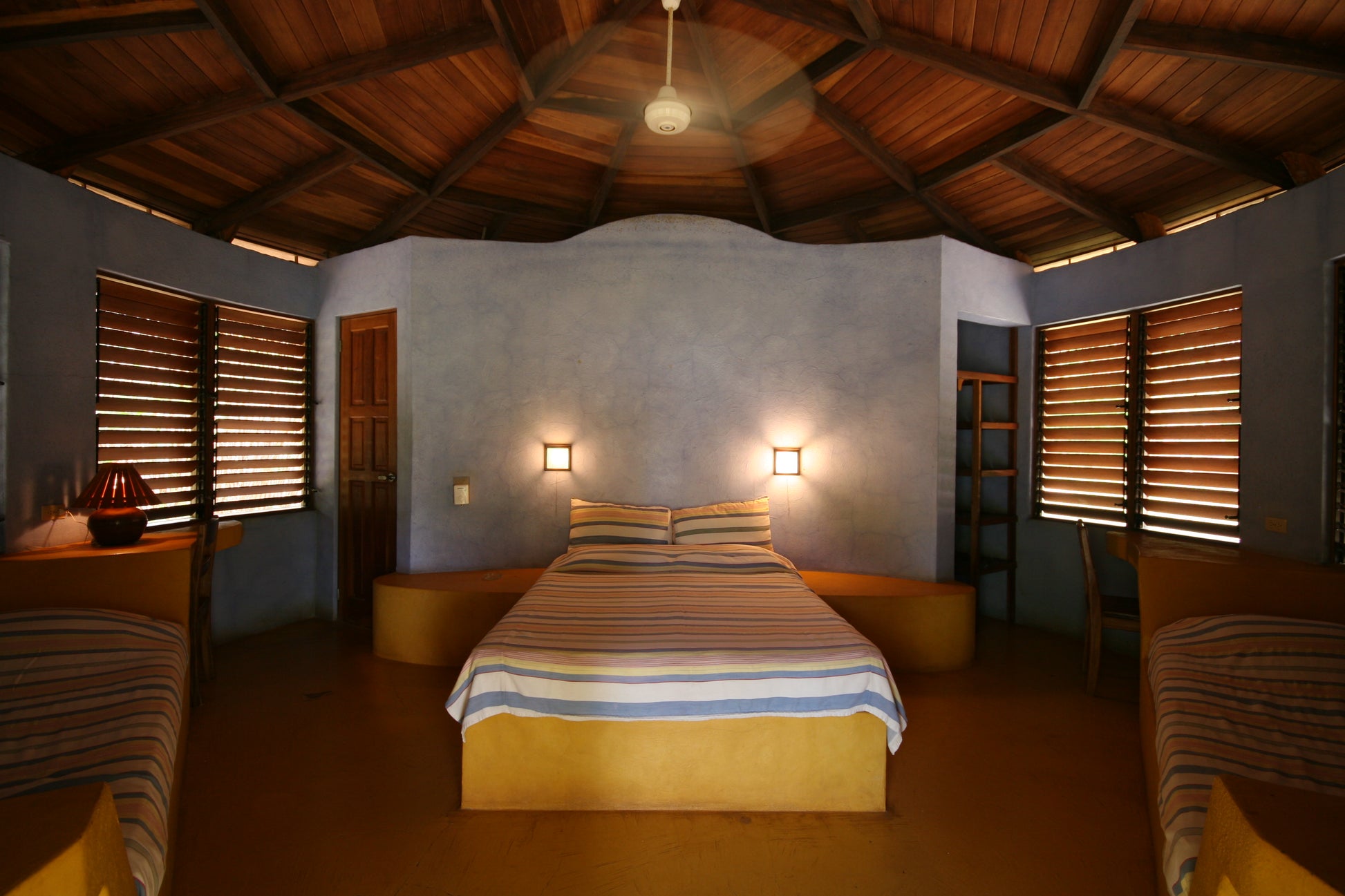 Circular bungalows with their palm leaf roofs are set right behind the beachfront restaurant and a few steps away from the swimming pool as well as the beach. The high ceilings and the windows all around allow the sea breeze to cool the rooms naturally. There is also a ceiling fan for the hottest days or nights. There is one queen-size bed and two twin beds in each bungalow, as well as a private bathroom with hot water. This means you will either have to share the queen, or one person will have to sleep on one of the twin bed. Guests can also sit on the porch on a couple of comfortable wooden chairs, enjoying the view of the gardens, the swimming pool or the beach. A coffee maker and Wi-Fi are available in-suite too.
